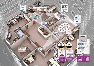 Applications: Indoor air quality (IAQ) monitoring, energy management, occupancy detection, lighting control and leak detection.